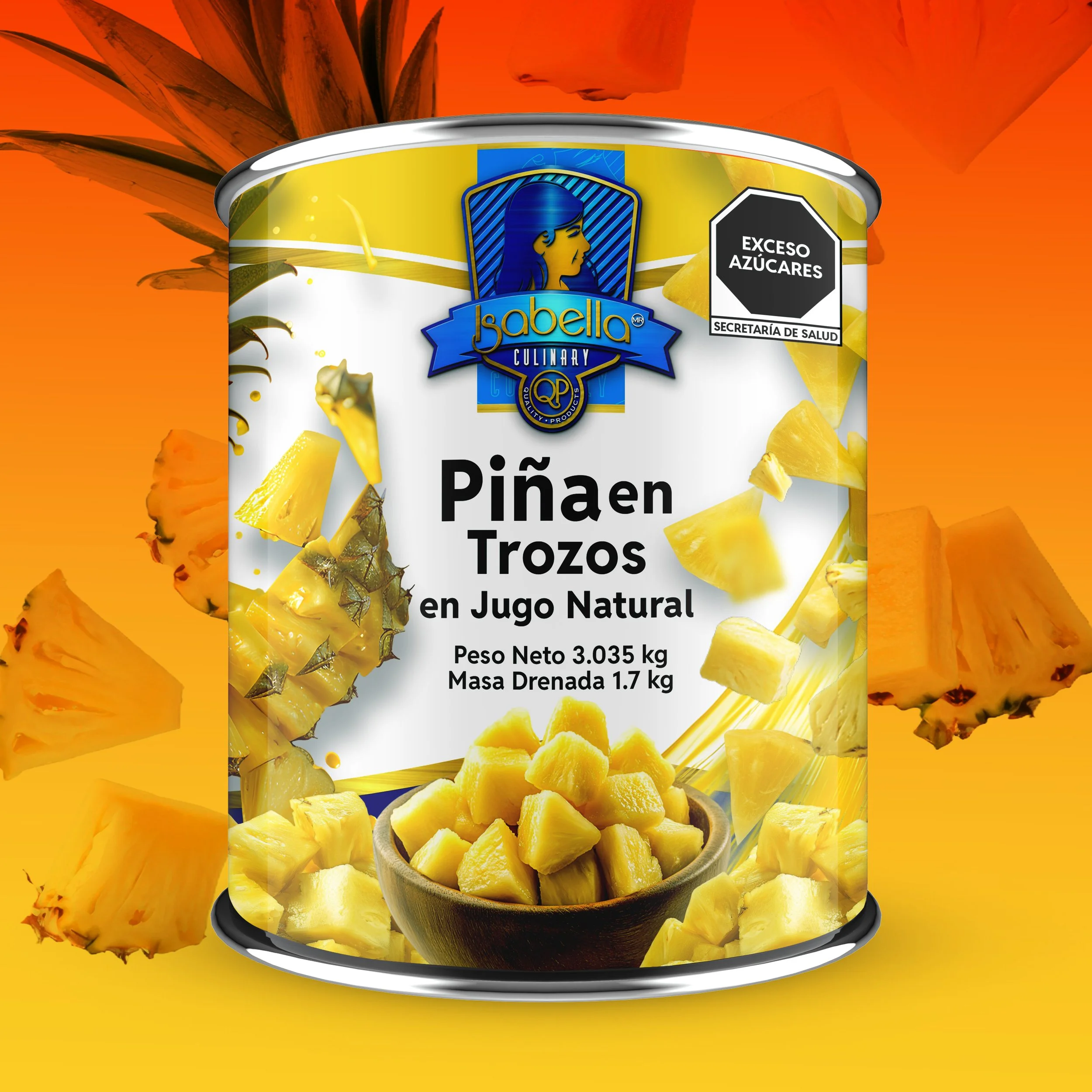 Prácticos trozos de piña dulce conservados en su propio jugo natural, no en almíbar. Ofrece un sabor más fresco y un dulzor equilibrado para la pizza Hawaiana.